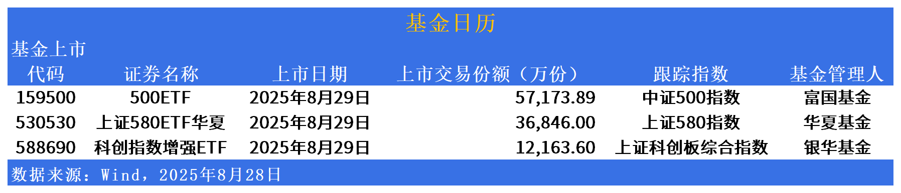 具体来看,明日上市的为富国500ETF(159500)、上证580ETF华夏(530530)、银华科创指数增强ETF(588690)。分别跟踪中证500指数、上证580指数、上证科创板综合指数。
