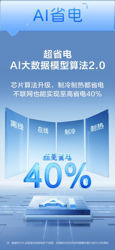 AI省电也是TCL小蓝翼P6 Plus AI健康空调的一大亮点,它采用AI大数据模型算法2.0,芯片算法升级,不联网也能实现至高省电40%。超一级能效,APF值高达4.8,远高于国家一级能效标准,全年可省电650度,为用户节省电费的同时,也为环保做出了贡献。