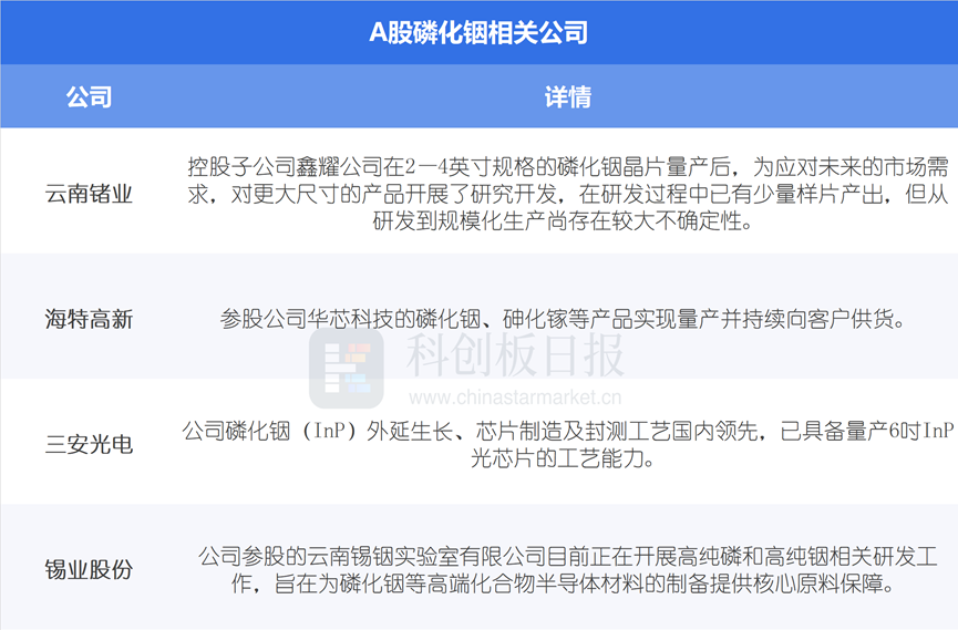据《科创板日报》不完全统计,A股中磷化铟相关公司有: