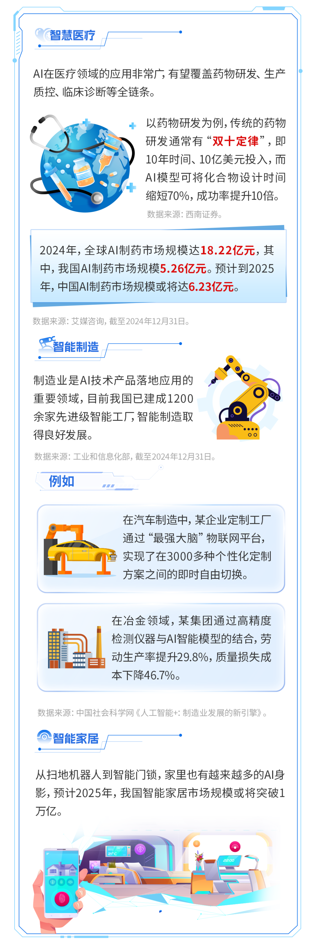 而应用层是在前两者的基础上,切入不同的场景和应用,提供产品和解决方案,涉及制造、医药、教育等众多垂直领域。