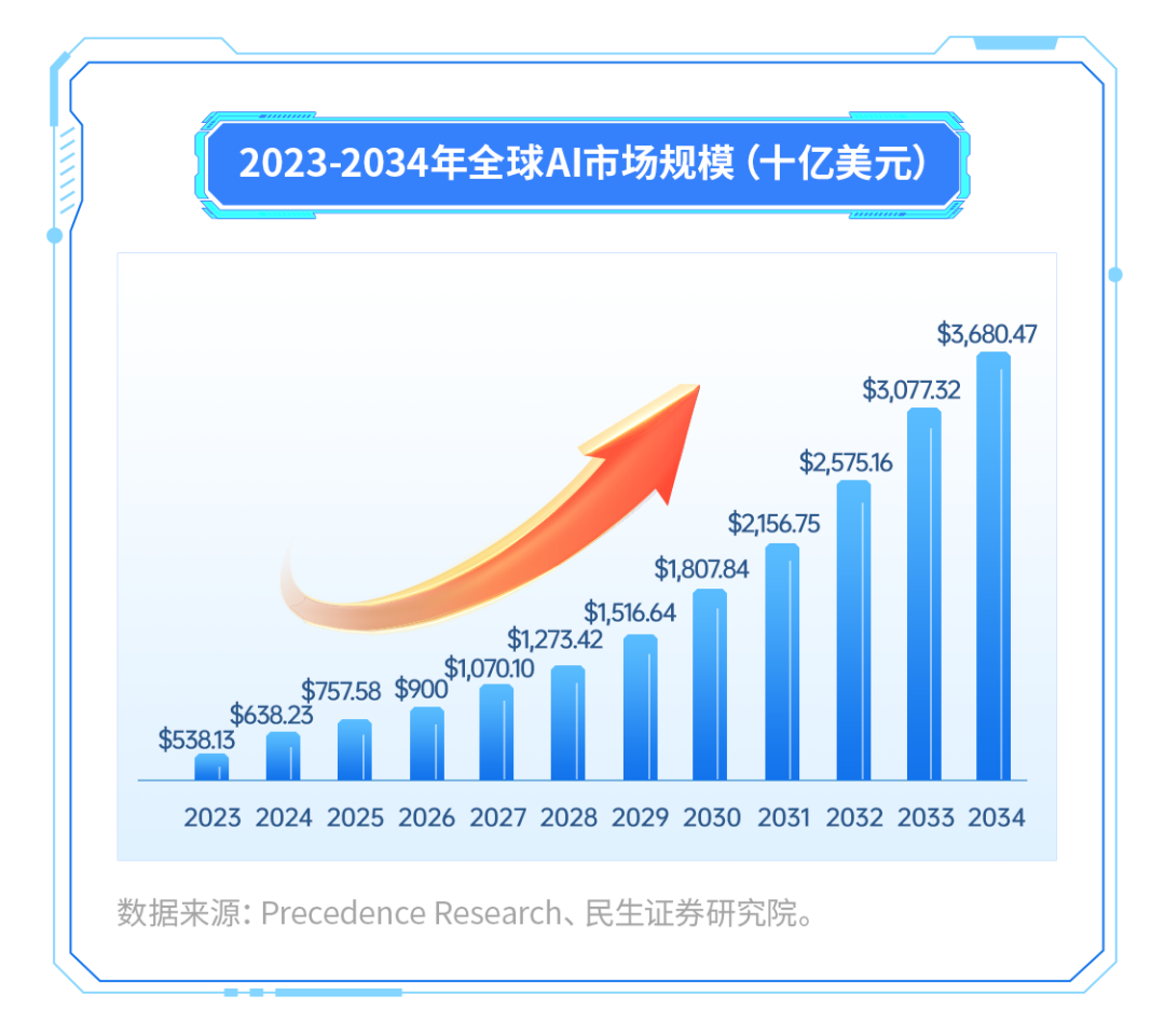 目前来看,AI其实仍处于发展的初期阶段,未来几年,全球AI市场规模将持续扩增,或将成为万亿美元级市场。据有关机构预测,2024-2034年全球AI市场规模有望持续大幅增长。