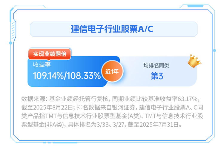 建信电子行业股票A/C成立于2023年4月11日,2023年(4月11日-12月31日)、2024年、2025年上半年基金净值增长率为1.08%/ 0.79%、15.66%/15.19%、4.46%/4.27%,同期业绩比较基准收益率为-5.84%、16.01%、2.96%。该基金自2023年4月11日起由江映德管理至今。