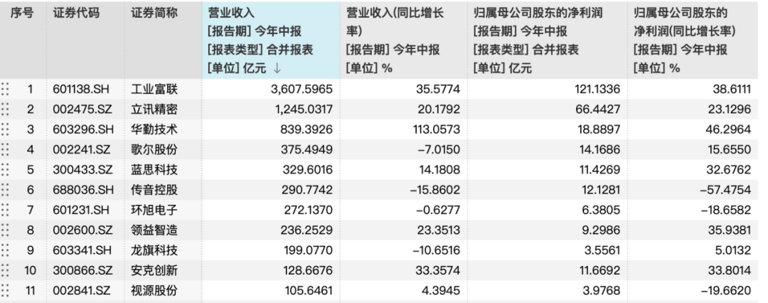 除工业富联外,Wind数据显示,2025年上半年消费电子板块共有11家企业营收突破百亿元。立讯精密、华勤技术、歌尔股份、蓝思科技等头部公司表现突出,营收分别达到1245.03亿元、839.39亿元、375.49亿元、329.60亿元。