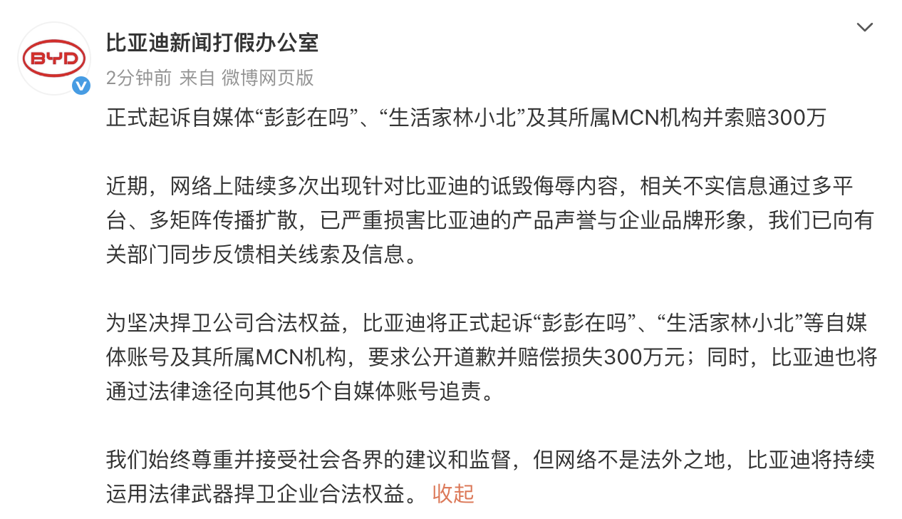 比亚迪表示,为坚决捍卫公司合法权益,将正式起诉“彭彭在吗”、“生活家林小北”等自媒体账号及其所属MCN机构,要求公开道歉并赔偿损失300万元;同时,比亚迪也将通过法律途径向其他5个自媒体账号追责。