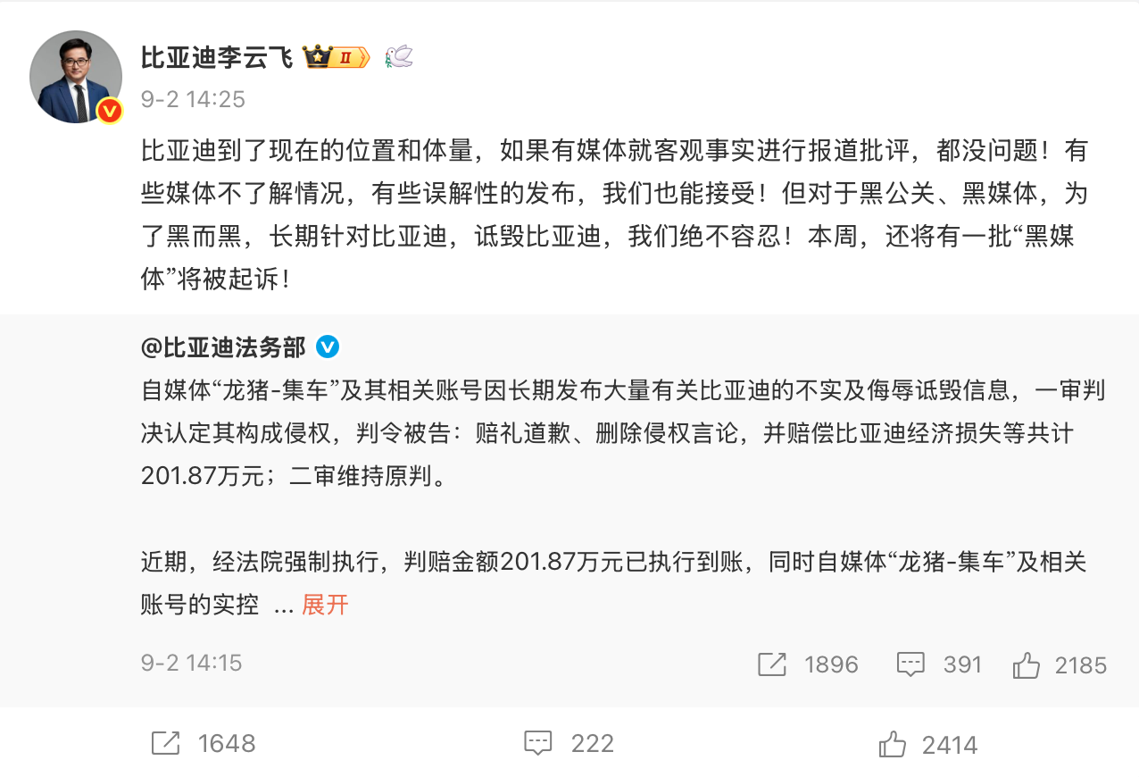 此前9月2日,比亚迪集团品牌及公关处总经理李云飞发文表示,对于黑公关、黑媒体,为了黑而黑,长期针对比亚迪,诋毁比亚迪,绝不容忍。李云飞透露,本周还有一批“黑媒体”将被起诉。