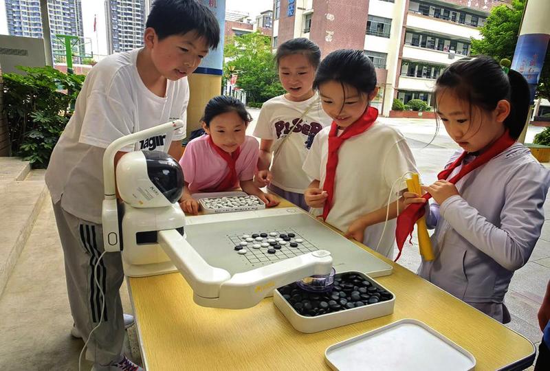 体育馆廊下的明亮角落,几张光滑的棋盘桌静静摆着。二年级的沈俊辉正和一位特别的“对手”——一台造型酷酷的“独手臂”智能机器人下棋呢!棋盘边缘的小灯闪烁着幽蓝的光,那是“独臂大师”在飞速思考呢!