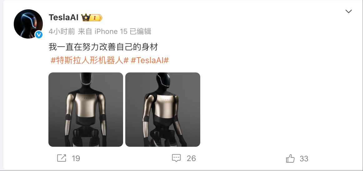 人民财讯9月7日电,特斯拉现已开通名为“TeslaAI”的官方微博,认证为“特斯拉官方账号”。目前,该微博已经发布一条图文内容,主要展示了特斯拉人形机器人的外观,该机器人身上印有特斯拉Logo,整体配色以浅金色和黑色为主。9月7日晚间,特斯拉官方微博转发“TeslaAI”微博内容,并配文:“加速进化中”。