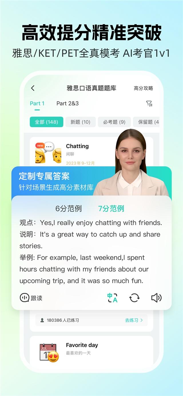 涵盖即时跟读评分、自由话题论述、全真模考三种模式,从基础音标到高阶表达逐步进阶,搭配发音器官动态演示,让每个发音都标准到位。