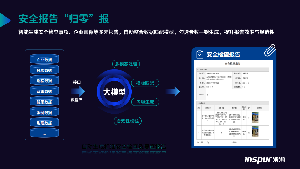 在2025年重庆智博会召开之际,浪潮科技重磅推出新一代“应急安全大模型”产品,以人工智能技术深度重构传统应急管理流程,实现从风险感知、智能决策到执行反馈的全链路智能化升级。该产品深度融合多源数据与行业知识,显著提升安全响应效率与隐患治理水平,打造“能听、会看、善思考、可闭环”的应急管理新范式。