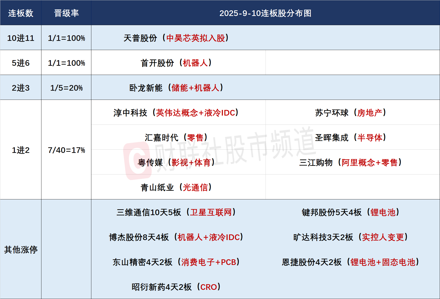 财联社9月10日讯,今日47股涨停,22股炸板,封板率为68%,天普股份11连板,首开股份6连板,卧龙新能3连板,三维通信10天5板,键邦股份5天4板,圣晖集成6天4板,青山纸业7天4板,汇嘉时代8天4板。市场震荡拉升,三大指数盘中出现冲高回落后再反弹。沪深两市成交额1.98万亿,较上一个交易日缩量1404亿。盘面上,市场热点快速轮动,全市场上涨个股和下跌个股数量基本相当。板块方面,油气、影视院线、算力硬件等板块涨幅居前,电池、有色金属、风电等板块跌幅居前。截至收盘,沪指涨0.13%,深成指涨0.38%,创业板指涨1.27%。