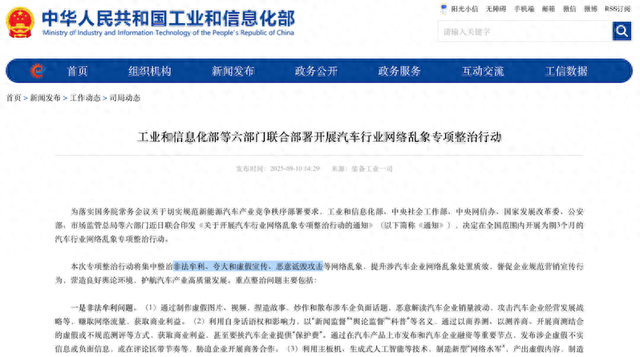 9月10日,《中国经营报》记者从有关部门了解到,为落实国务院常务会议关于切实规范新能源汽车产业竞争秩序部署要求,工业和信息化部、中央社会工作部、中央网信办、国家发展改革委、公安部、市场监管总局等六部门近日联合印发《关于开展汽车行业网络乱象专项整治行动的通知》(以下简称《通知》),决定在全国范围内开展为期3个月的汽车行业网络乱象专项整治行动。