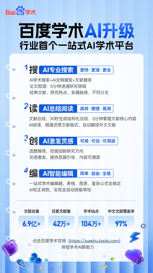 截至目前,百度学术已收录6.9亿文献资源,文献规模位列全球领先。此外,覆盖超104万学术资源站点,日均更新文献量超42万,中文文献覆盖率达97%,均位列国内第一,是全球AI能力最强大、学术资源最丰富的学术平台之一。