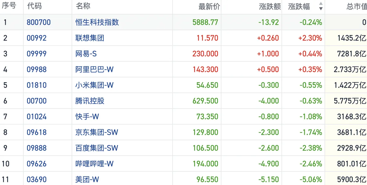 盘面上,今日大型科技股普遍走低,尤其是美团跌6%刷新阶段新低,百度跌2.38%,京东跌近2%,快手跌1%,腾讯、小米飘绿,阿里巴巴、网易小幅上涨。