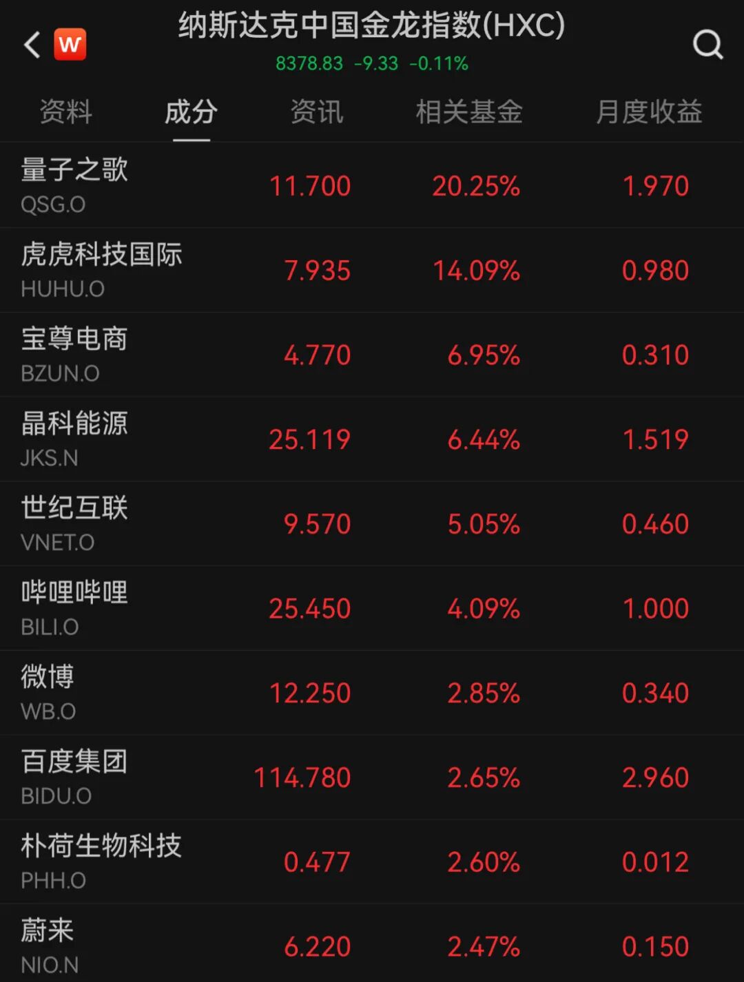 Wind数据显示,纳斯达克中国金龙指数跌0.11%。量子之歌大涨20.25%,虎虎科技国际涨14.09%。
