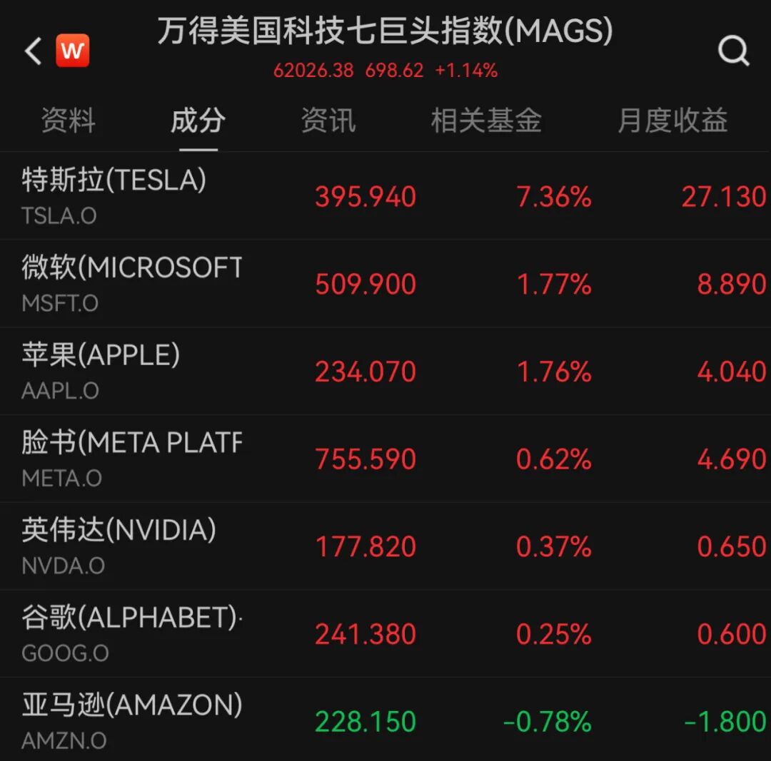 美股科技七巨头仅亚马逊小幅下跌。Wind数据显示,截至收盘,万得美国科技七巨头指数上涨1.14%,特斯拉大涨7.36%。