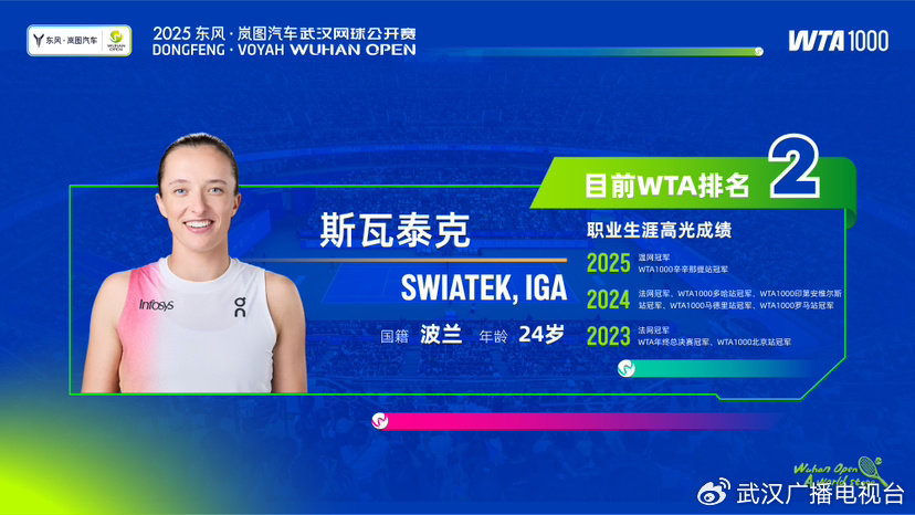 同时,赛事组委会公布了多项观众服务、票务类型与宠粉活动的创新举措,致力于为球迷打造沉浸式、高品质的观赛体验,进一步推动网球文化与城市活力的深度融合。作为临近WTA年终总决赛的焦点赛事,武网不仅是运动员竞逐积分、冲击荣耀的终极战场,更是武汉向世界展示国际体育名城形象、彰显办赛水准与城市活力的高光舞台,必将谱写中国网球赛事全新篇章。