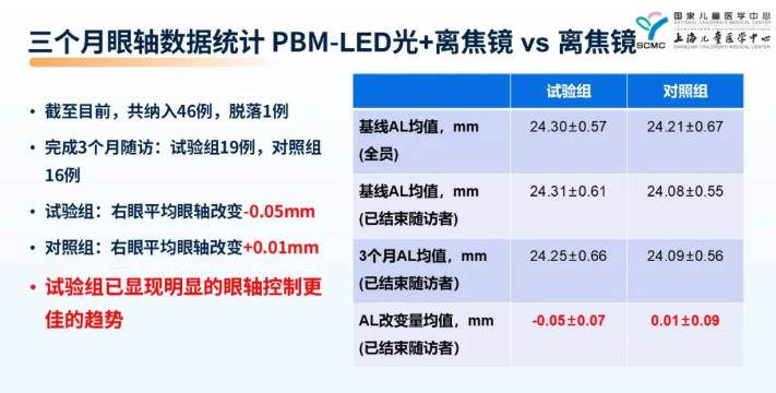 在中华医学会第二十九次眼科学术大会上,上海交通大学医学院附属上海儿童医学中心眼科刘红教授带来题为《光生物调节应用于近视控制的研究》的报告,其分享了上海儿童医学中心开展的一项前瞻性随机对照临床试验,试验组采用基于PBM光生物调节疗法、采用鹰瞳特殊设计的LED光疗方案(简称“PBM-LED光疗”)联合离焦镜,对照组则仅使用离焦镜。三个月的结果显示,试验组在眼轴控制方面相较于对照组展现出明显优势。