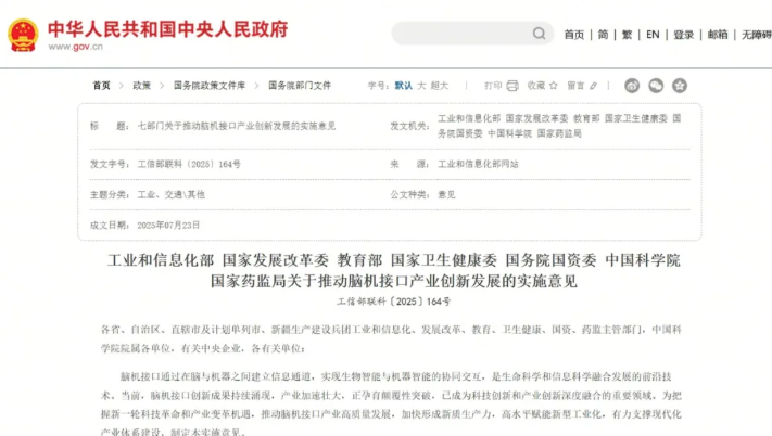 2025年7月23日,工业和信息化部、国家发展改革委、教育部、国家卫生健康委等多部门联合发布了《关于推动脑机接口产业创新发展的实施意见》。