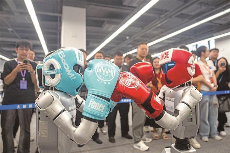 9月15日,以“AI领航 畅想湘江”为主题的2025互联网岳麓大会在长沙开幕。本次大会聚焦人工智能等前沿技术,将举办大学生创新创业、AI+创新生态、AI+文化、AI+智能网联等9个主题论坛。图为两台人形机器人在进行拳击表演。新华社发