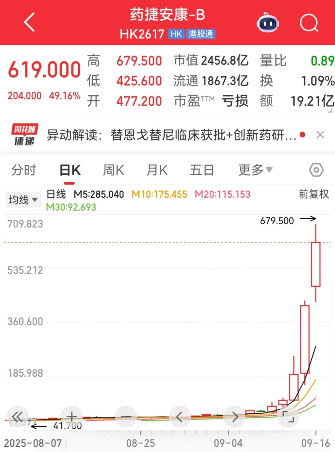 今天上午,港股药捷安康上涨49.16%。该股最近连续大涨,9月15日上涨115.6%,9月12日上涨77.09%,9月11日上涨20.78%,9月10日上涨27.57%。