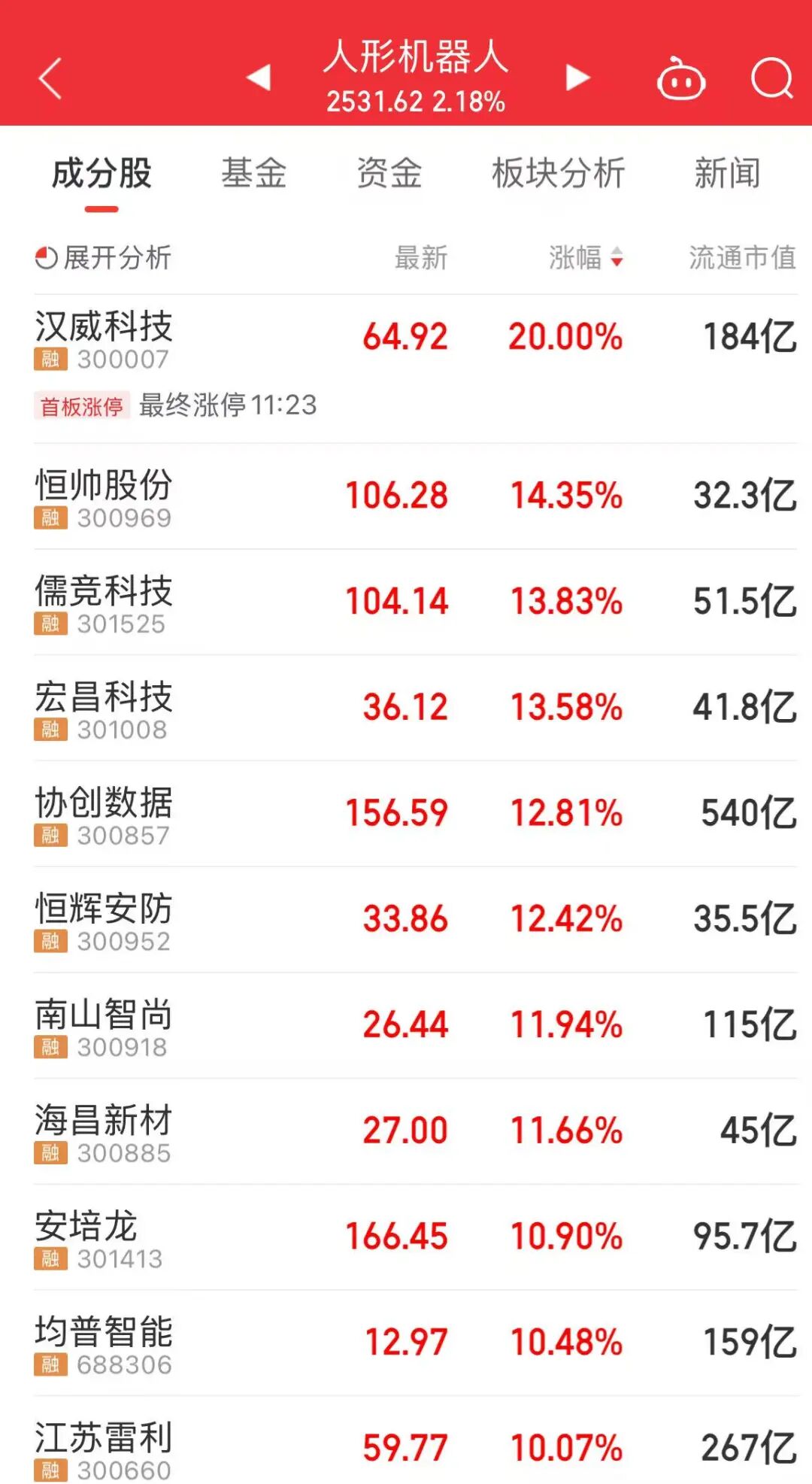 最近,人形机器人板块情绪回暖,今天上午,板块再度走强,汉威科技、恒帅股份、南山智尚等个股大涨。