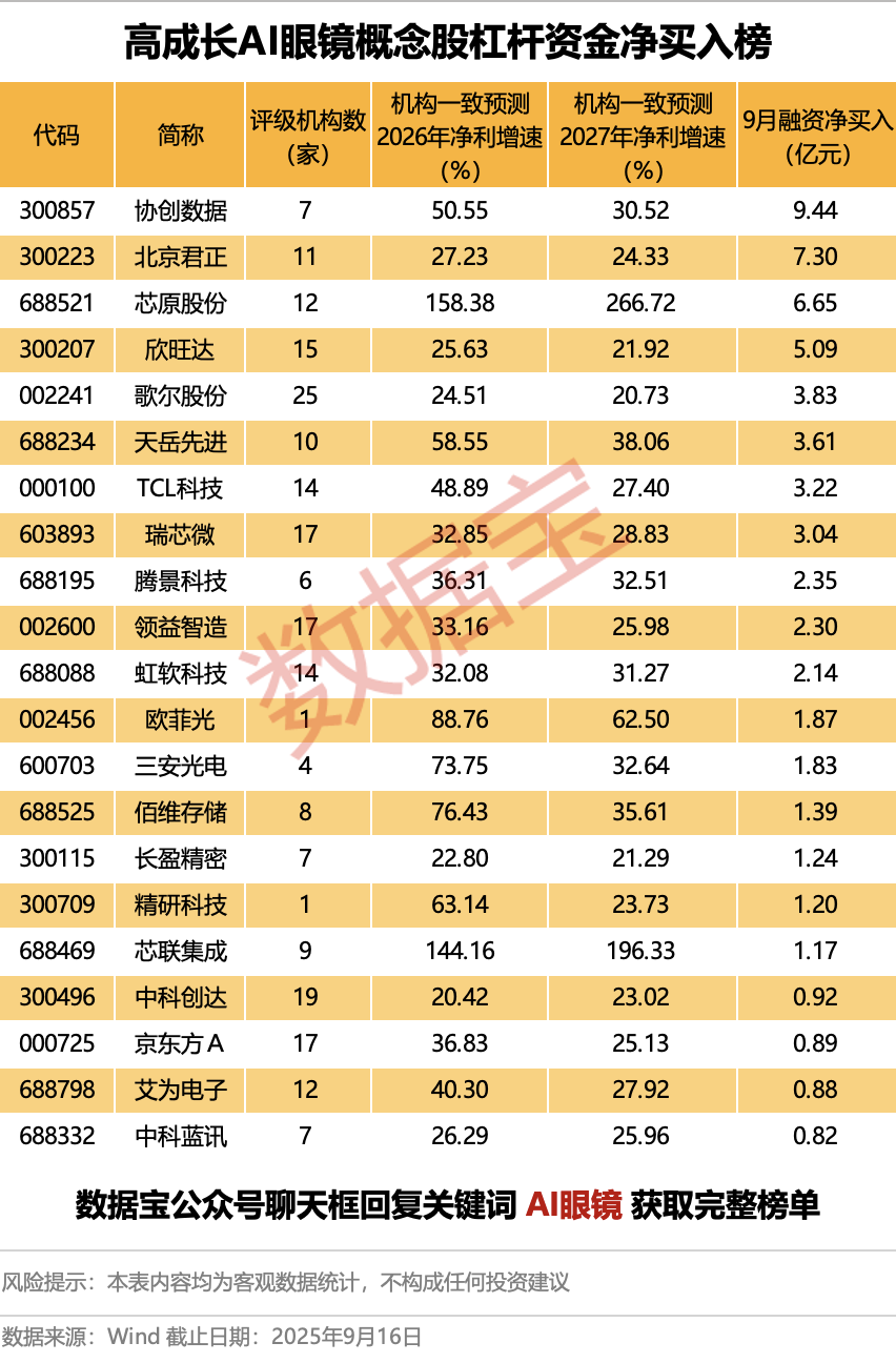 概念板块中,暗藏着杠杆资金加仓的高成长股。据证券时报·数据宝统计,9月以来,融资净买入的AI眼镜概念股中,有41股机构一致预测明年、2027年净利增速均超20%。