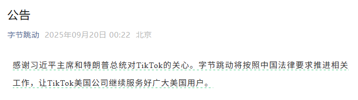 新京报讯 9月20日凌晨,字节跳动发布公告称,字节跳动将按照中国法律要求推进相关工作,让TikTok美国公司继续服务好广大美国用户。
