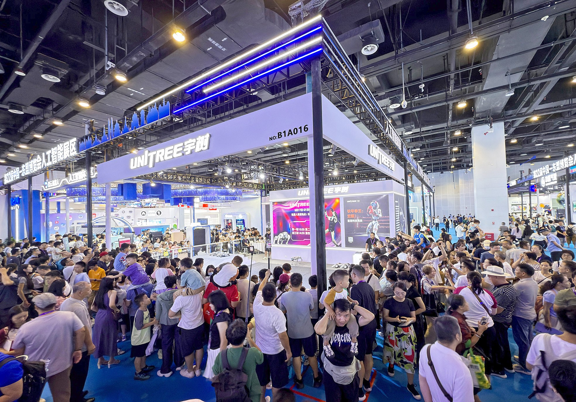 AI专馆是东博会最具人气的“科技打卡地”。宇树科技展台外围满了观众,场面火热。