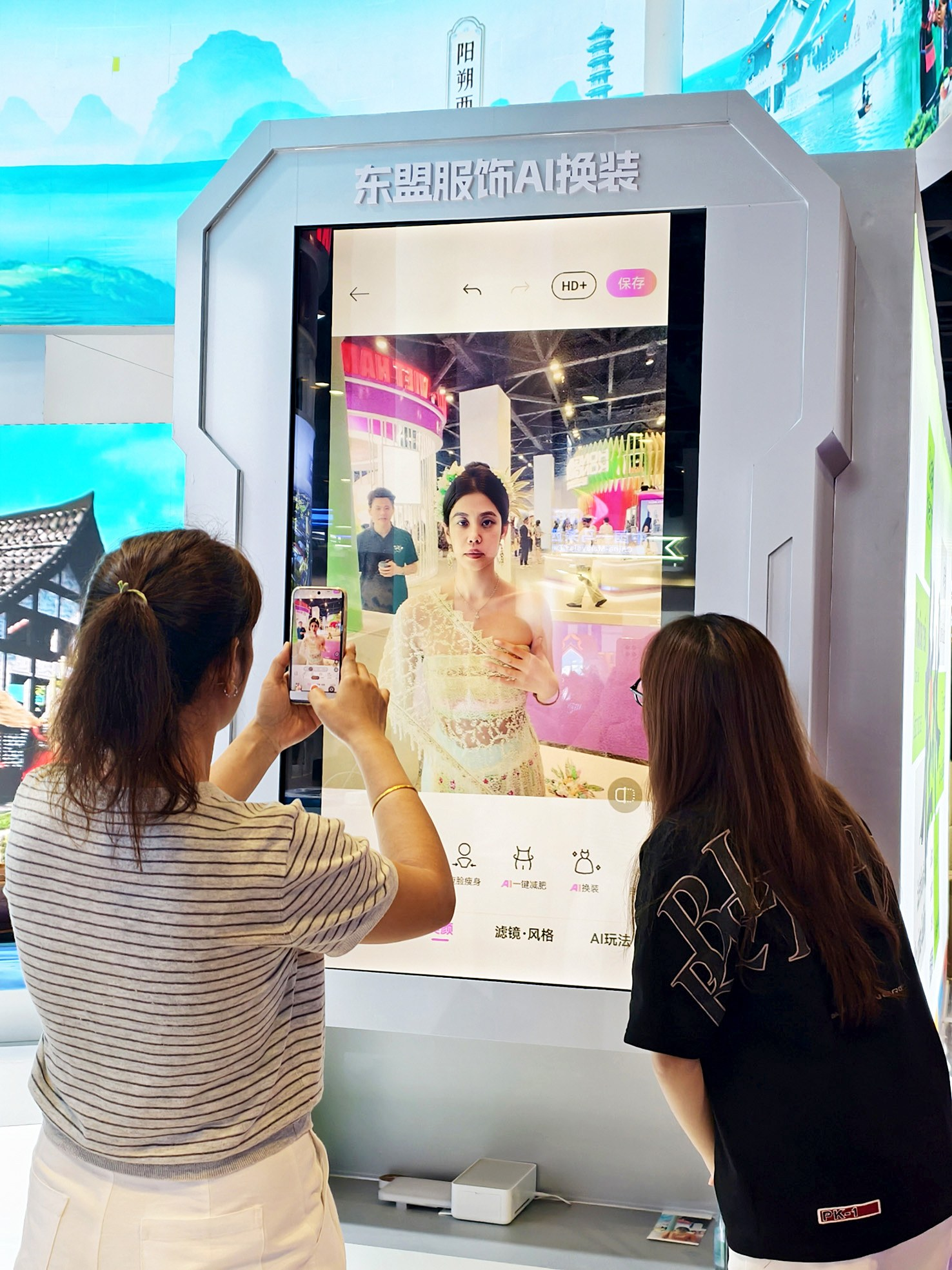 AI专馆里,各类AI影像创作体验备受青睐,观众争相排队体验。体验者点击AI智能拍照机屏幕上的“拍摄”按钮,短短几秒钟就能获得风格各异的艺术照,从古风戏曲到科幻未来风,各种风格应有尽有。其中,华为展台的“AI+云镜之旅”无疑是最受欢迎的打卡点。这项创新技术让体验者体验到“一秒穿越”的快乐,在柬埔寨吴哥窟、马来西亚双子塔、越南粉红教堂、缅甸仰光大金塔等地标前打卡留念。