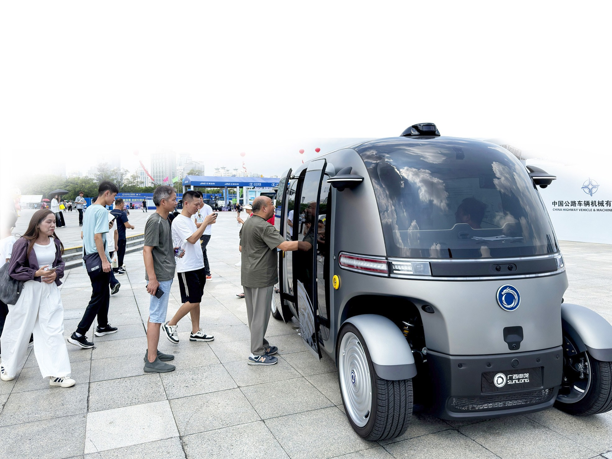无人驾驶接驳车吸引观众排队体验。