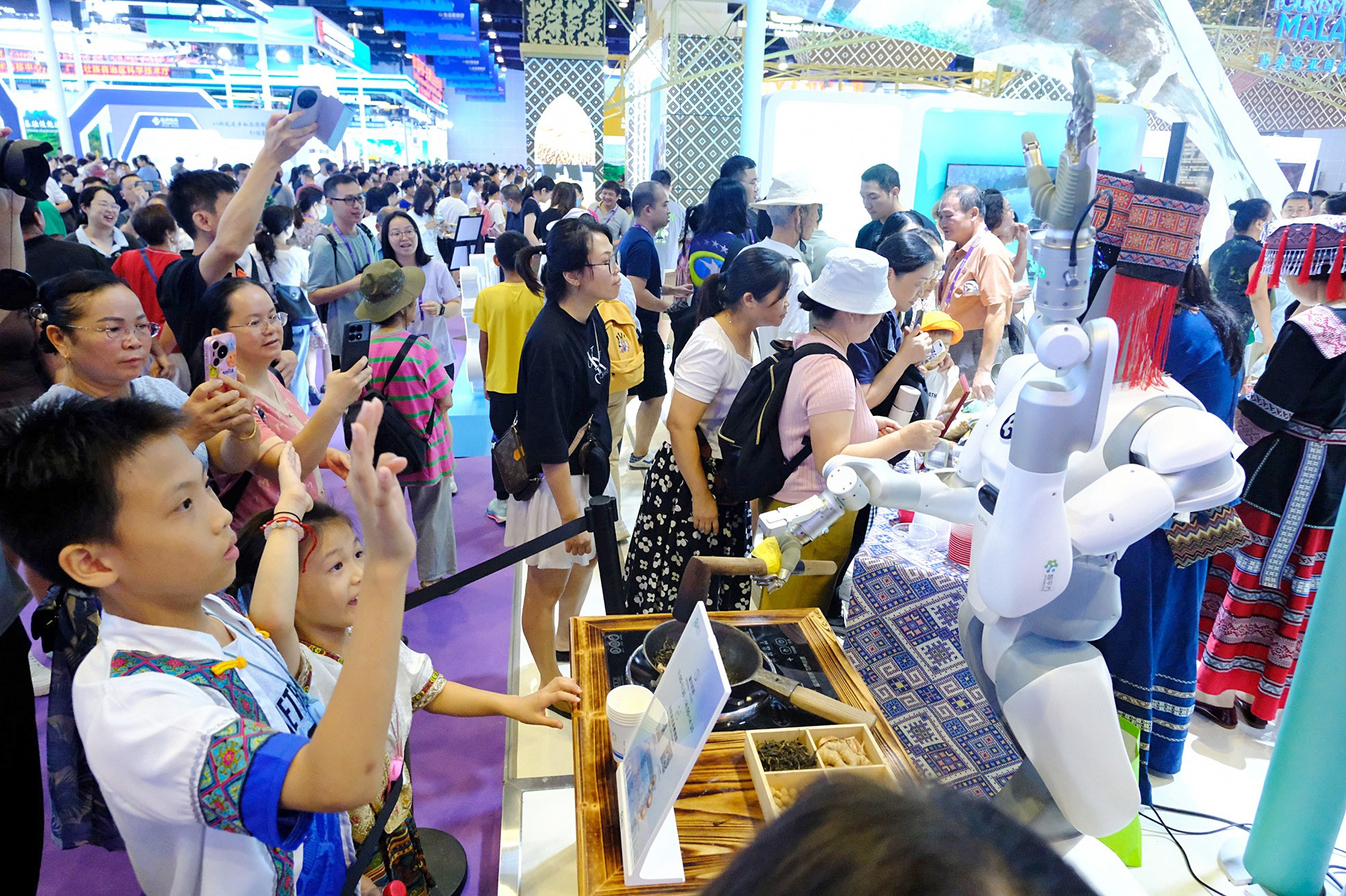 “魅力之城”桂林市展区,孩子们和打油茶机器人互动。