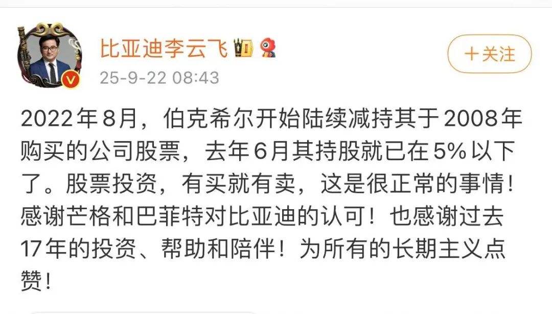 针对巴菲特旗下伯克希尔哈撒韦已清仓比亚迪股份的消息,比亚迪集团公关处总经理李云飞发文回应称,2022年8月,伯克希尔开始陆续减持其于2008年购买的公司股票,去年6月其持股就已在5%以下了。股票投资,有买就有卖,这是很正常的事情。感谢芒格和巴菲特对比亚迪的认可,也感谢过去17年的投资、帮助和陪伴,为所有的长期主义点赞。