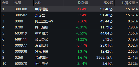 受消息催化,光模块再度大涨,中际旭创涨超4%,新易盛涨超3%。云计算ETF汇添富(159273)的其他权重股中,阿里巴巴-W涨超2%,浪潮信息涨近1%。