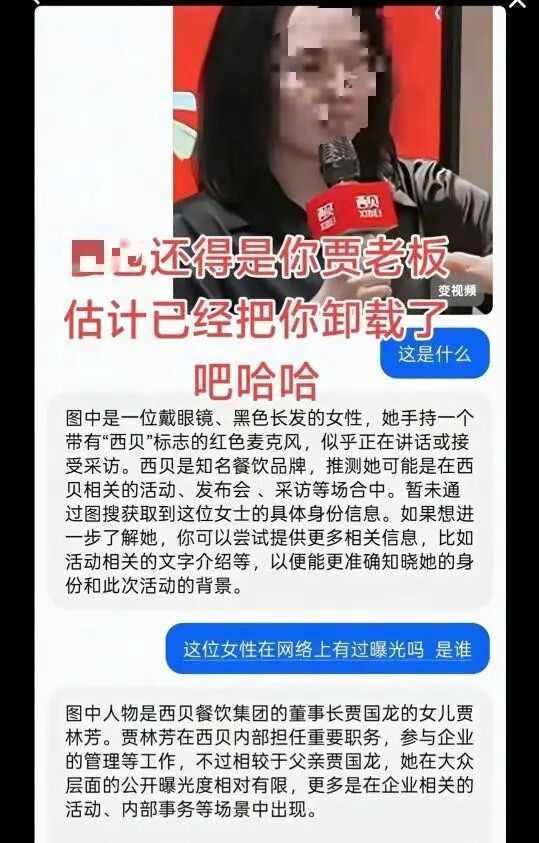 9月28日,记者注意到有网友指出,在某AI平台对“1岁孩子在西贝学会吃饭”中宝妈进行分析后,生成信息称该宝妈实为“西贝餐饮创始人、董事长贾国龙女儿贾林芳”,引发热议。