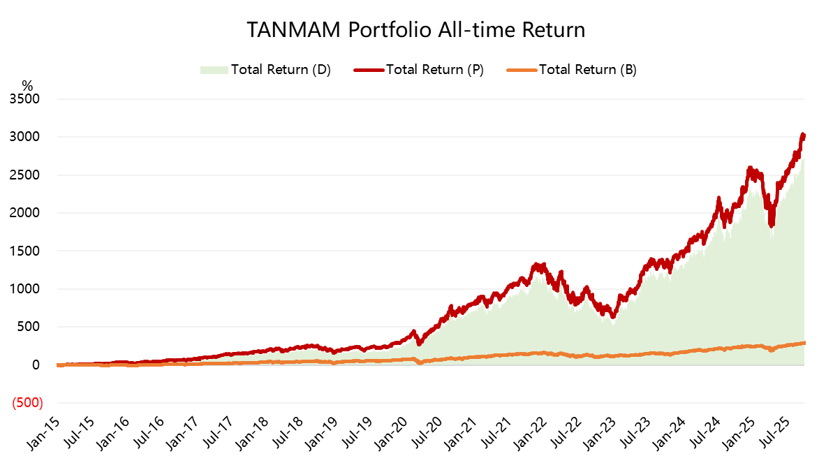 七巨头(Magnificent Seven)组成一个投资组合(“TANMAMG”组合),等权重、每季度重新调整权重。回测结果从2015年以来表现是远超 $标普500(.SPX)$ 的,总回报达到了3016.78%,同期 $标普500ETF(SPY)$ 回报291.49%,超额收益2725.29%,仍然在高位。