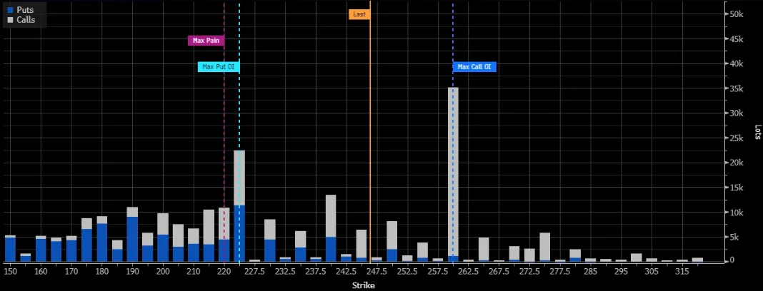 从期权上来看,GOOG的当前价格之外的CALL主要在260(10月期权)和290(11月期权)两个位置的超量大单,Delta和Gamma的影响相对也小,目前市场计价尚未充分。