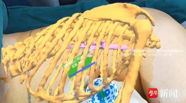 病人麻醉后,潘相龙医生戴上AR眼镜,目光聚焦患者的病灶区域,通过调整视角找准结节位置,手持定位针,并循着导航提示的“最优路径”,稳稳将一枚“伞形”标记物送到结节旁并释放——整个过程像 “精准打靶”,巧妙避开了肋骨和血管,全程流畅又安全。