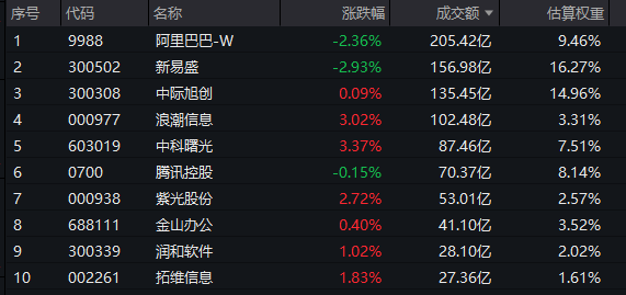 云计算ETF汇添富(159273)标的指数涨跌互现,中科曙光涨超3%,浪潮信息、紫光股份涨超2%,拓维信息涨超1%,金山办公、润和软件微涨;下跌方面,新易盛跌超3%,阿里巴巴跌超2%,中际旭创、腾讯控股微跌。