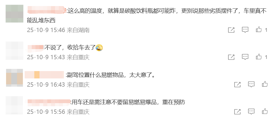 对此,多名网友纷纷表示,“车内还是不要放易燃易爆物品”“给了我一个把车收拾下的理由”“不说了,收拾车去了”。