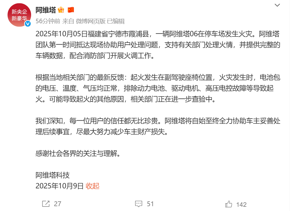 10月9日,阿维塔官方账号发布微博,对近期阿维塔06火灾事故作出说明。