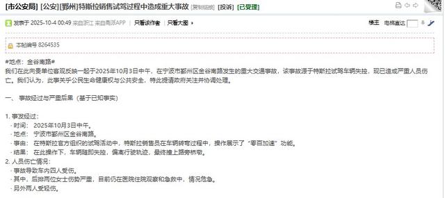 近日,网友反映,10月3日中午,在宁波鄞州区金谷南路,特斯拉官方组织试驾活动,销售员操作展示功能过程中,车辆发生失控撞上路边桥墩,导致车内4人受伤,其中2名女士伤势严重住院,希望有关部门协调处理。