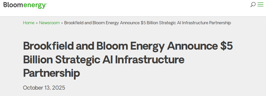 新闻稿称,美国资产管理公司Brookfield Asset Management将投资至多50亿美元,用于部署Bloom的先进燃料电池技术,两家公司将在全球范围内设计和交付“人工智能工厂”(AI factories)。