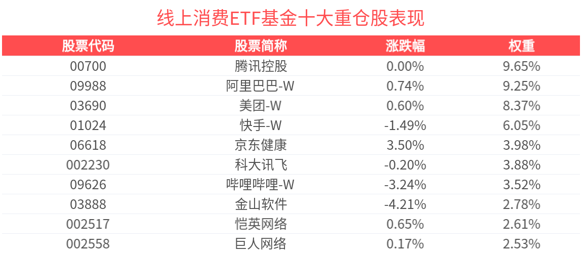 数据显示,截至2025年9月30日,中证沪港深线上消费主题指数(931481)前十大权重股分别为阿里巴巴-W(09988)、腾讯控股(00700)、快手-W(01024)、美团-W(03690)、京东健康(06618)、巨人网络(002558)、哔哩哔哩-W(09626)、科大讯飞(002230)、恺英网络(002517)、昆仑万维(300418),前十大权重股合计占比55.76%。