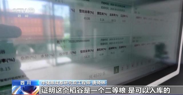 中储粮成都研究院工程师 唐琦林:可以看到,出糙率是78.51%,证明这个稻谷是二等粮,是可以入库的。