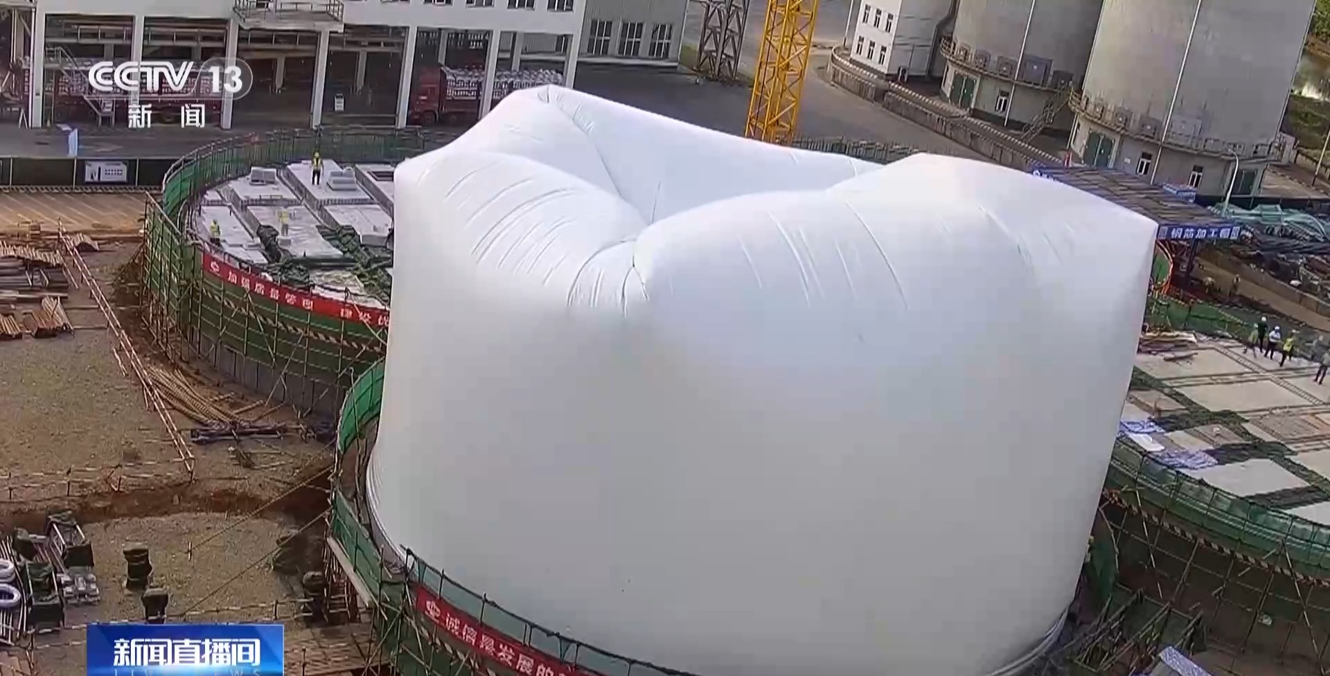 中储粮成都储藏院建筑师 包晓强:气膜仓整个仓顶结构的学术名词叫三心球形拱顶结构。这个结构的灵感来源是鸡蛋壳。常规粮仓的穹顶结构是一个半球形,无效空间就会很大,经济性不是很好。气膜仓的仓身段是一种非常圆滑的过渡,雨水就没有汇集的位置,可以保障我们粮仓的排水效果。