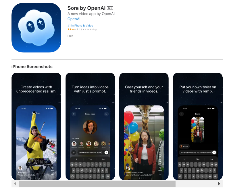 Sora App上线第四天,就拿下了苹果美国应用商店App Store的免费应用榜第一名,超越了Gemini和ChatGPT,堪称“出道即顶流”。
