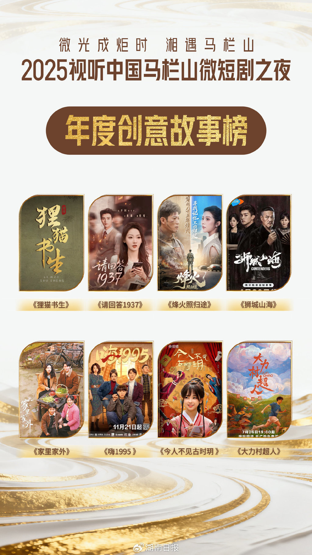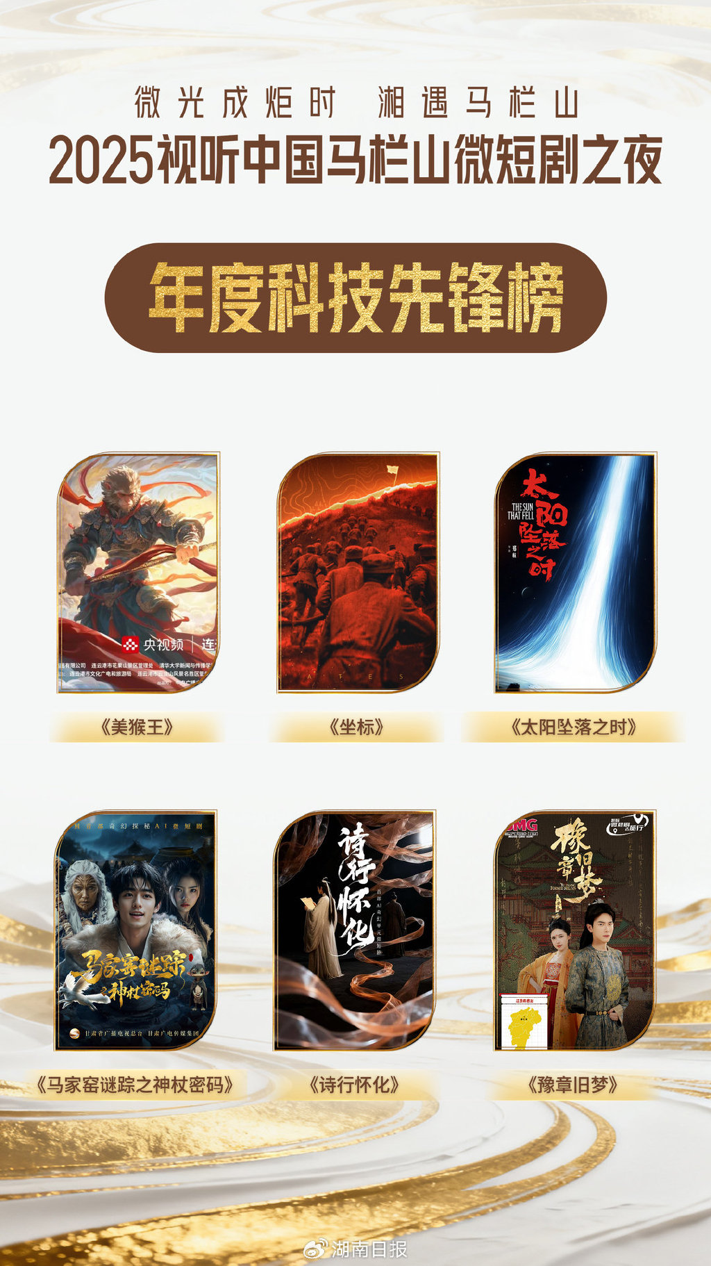 10月14日晚,“2025视听中国马栏山微短剧之夜”在长沙举办。活动现场不仅发布了“中国视听大数据微短剧大屏播出指数”、《精品微短剧创新发展趋势研究报告》、“马栏山微短剧智能服务平台”等多个行业报告及创新项目,还揭晓了年度创意故事榜等六大榜单,众多微短剧创作者成为领奖人。