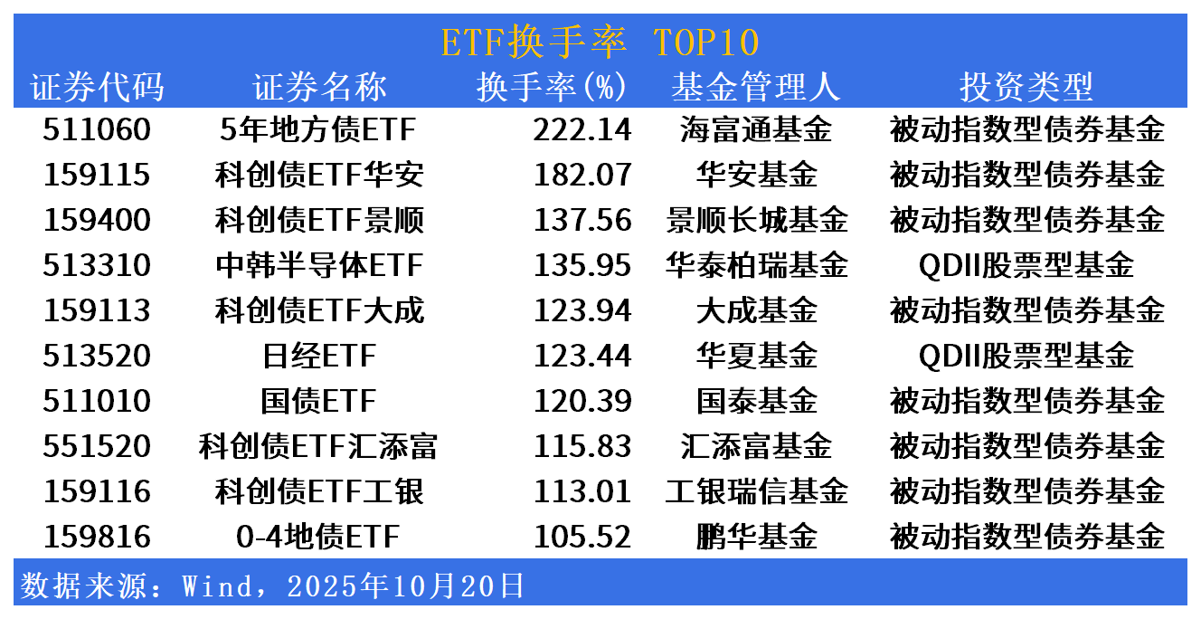 换手率方面,5年地方债ETF(511060)换手率居首,达222%。科创债ETF华安(159115)、科创债ETF景顺(159400)、中韩半导体ETF(513310)换手率居前。