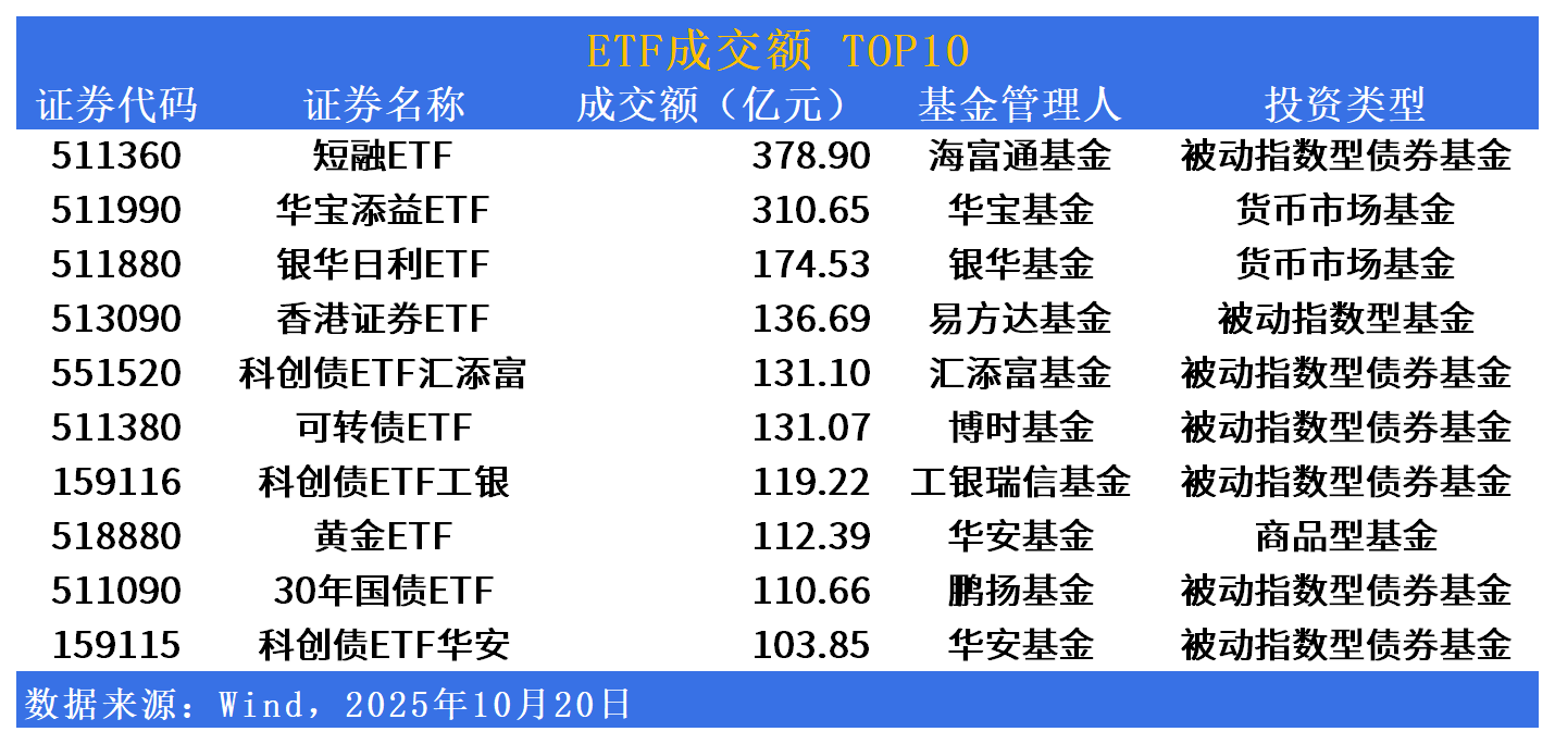 成交额方面,短融ETF(511360)今日成交额居首,达378亿元;华宝添益ETF(511990)、银华日利ETF(511880)、香港证券ETF(513090)成交额紧随其后。