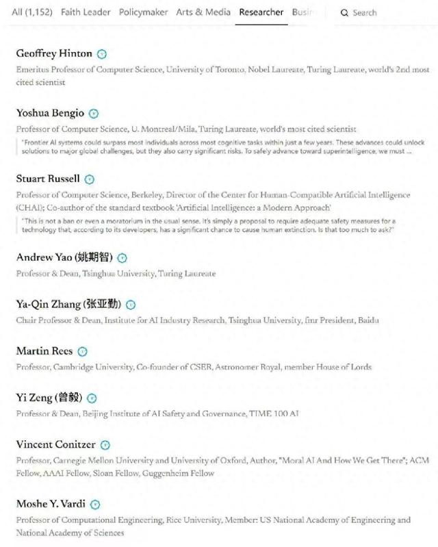 截至10月23日中午,这份声明的签署人数已经达3193人。中国科学院院士、图灵奖得主姚期智、清华大学智能科学讲席教授、智能产业研究院院长张亚勤,以及清华大学战略与安全研究中心学术委员、苏世民书院院长薛澜等中国学者也位列其中。